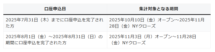 キャンペーン期間中にキャンペーンエントリーのうえ、2025年8月31日(日)までに口座申込を完了されたお客様が対象です。