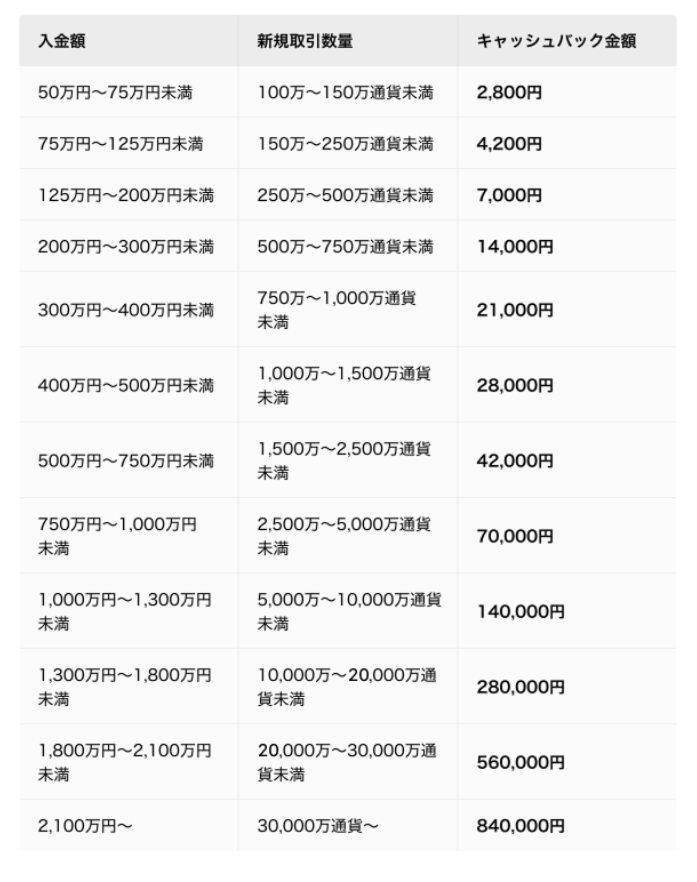 キャンペーン期間中の、入金額※および対象の通貨ペアの新規取引数量の合計に応じて、下表のとおりキャッシュバックいたします。